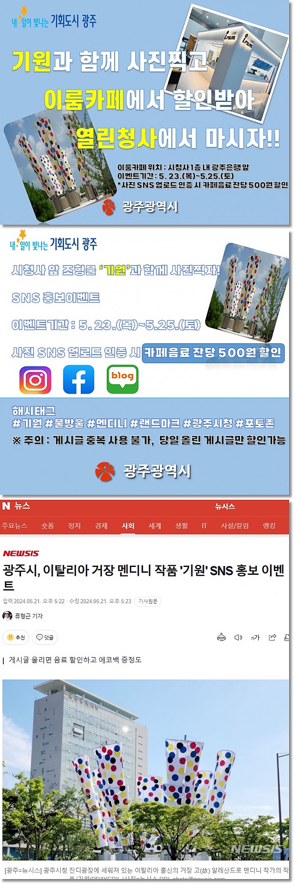 이룸카페 시청점 광주시민의날 할인 행사 페이지 정보 작성자 관리자 작성일24-06-10 15:14 조회2,238회 댓글0건 이전글 다음글 목록 본문 광주광역시 시민의날 행사 일환으로 시청사 앞 조형물 "기원"과 함께 사진찍고 SNS 인증 시 음료 할인행사를 진행했습니다. 이전글 다음글 목록