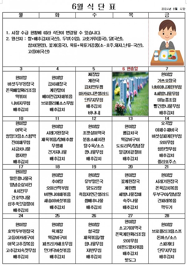2024년 6월 식단표 ^^ 페이지 정보 작성자 관리자 작성일24-05-30 18:47 조회2,478회 댓글0건 이전글 다음글 목록 본문 여름이 왔습니다! 여름이 왔어요! 땀이 나서 덥고 힘들지만 맛있게 먹고 힘 내서 6월도 잘 이겨내보겠습니다 ~^^ 이전글 다음글 목록
