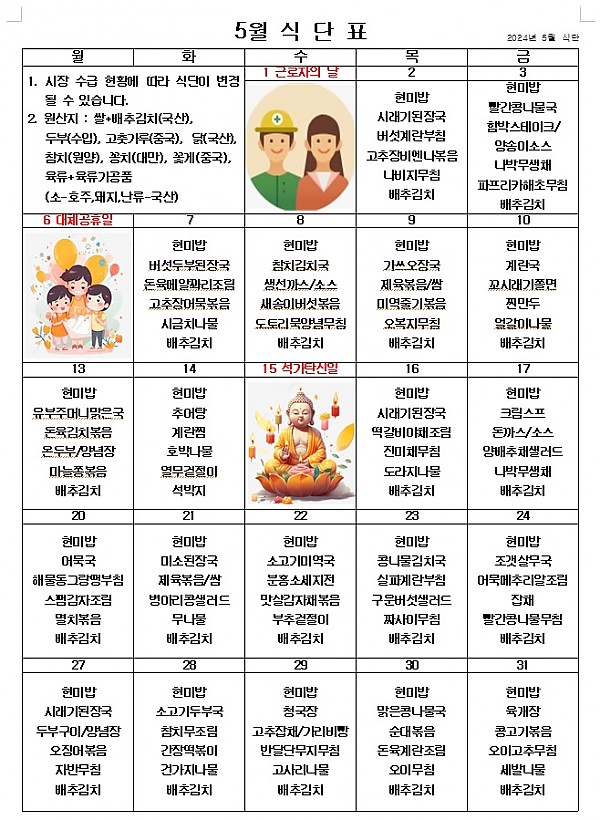 2024년 5월 식단표 ^^ 페이지 정보 작성자 관리자 작성일24-04-30 09:03 조회2,351회 댓글0건 이전글 다음글 목록 본문 5월에도 건강한 음식을 맛있게 먹고 힘내서 열심히 일하겠습니다! ^^ 이전글 다음글 목록