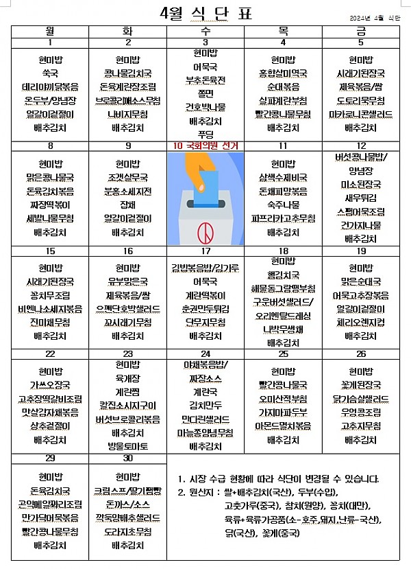 2024년 4월 식단표 ^^ 페이지 정보 작성자 관리자 작성일24-03-29 09:28 조회2,384회 댓글0건 이전글 다음글 목록 본문 푸르른 4월에도 맛있게 먹고 힘 내서 열심히 일하겠습니다! 이전글 다음글 목록