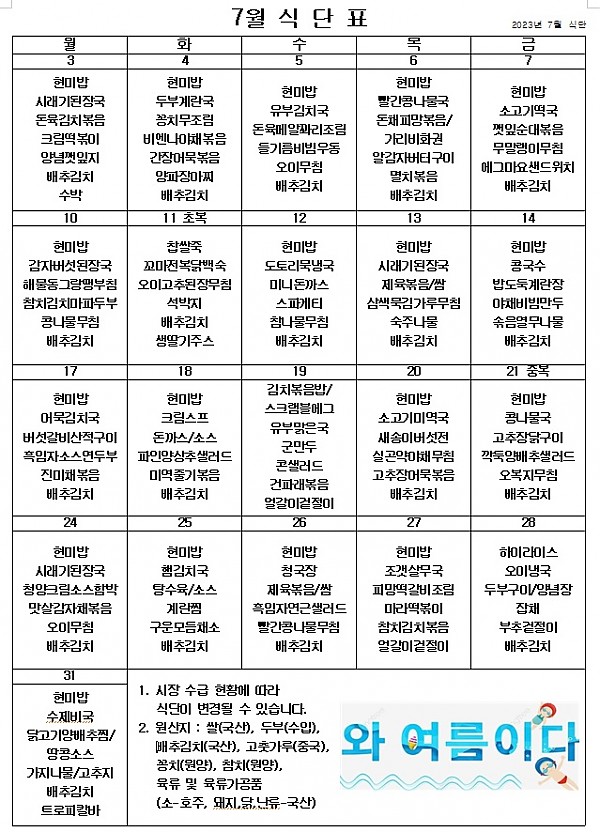 2023년 7월 식단표 ^^