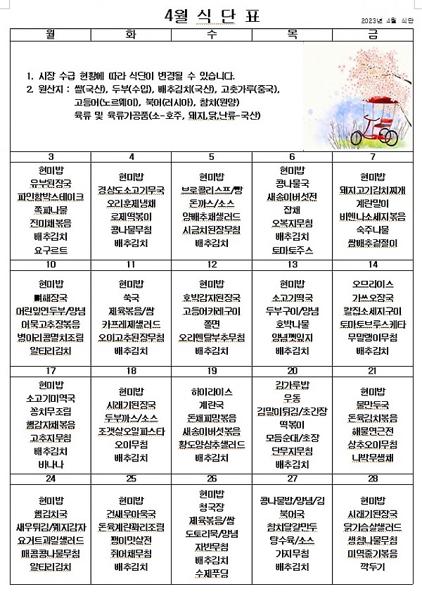 2023년 4월 식단표 ^^ 페이지 정보 작성자 관리자 작성일23-03-30 15:59 조회2,885회 댓글0건 이전글 다음글 목록 본문 자조모임 의견에서 나온 희망 식단, 희망 간식을 최대한 반영해보려고 했습니다. ^^ 4월에도 맛있게 먹고 힘 냅시다! 이전글 다음글 목록