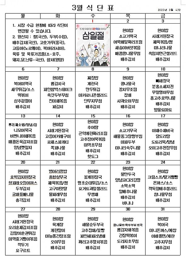 2023년 3월 식단표 ^^ 페이지 정보 작성자 관리자 작성일23-02-28 15:14 조회3,018회 댓글0건 이전글 다음글 목록 본문 3월에도 맛있게 먹고 열심히 달려보아요! ^^ 이전글 다음글 목록