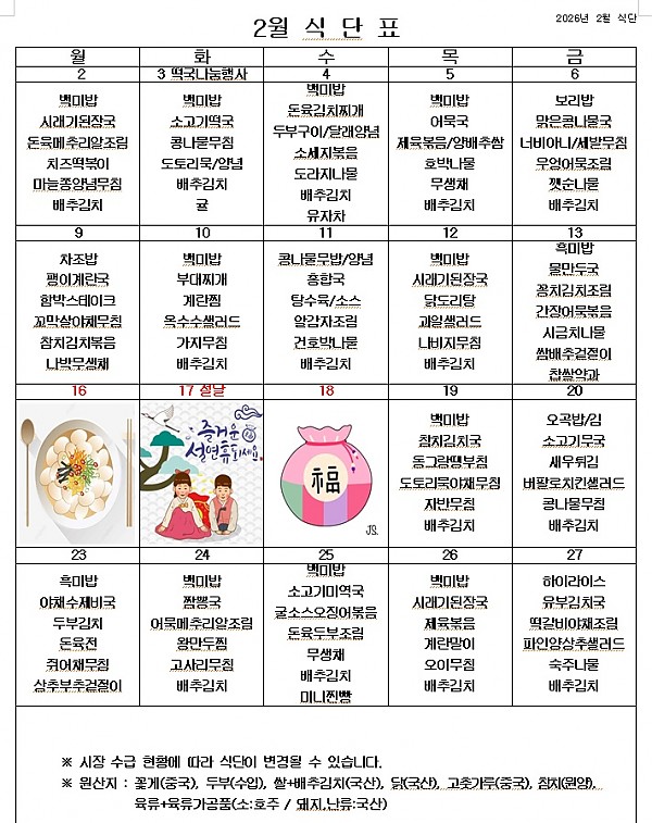 2026년 2월 식단표 ^^ 페이지 정보 작성자 관리자 작성일26-01-29 14:46 조회551회 댓글0건 이전글 다음글 목록 본문 2월에는 입춘도 있고, 설 명절도 있습니다. 2월에도 건강한 음식을 맛있게 먹고 열심히 일하겠습니다. 이전글 다음글 목록
