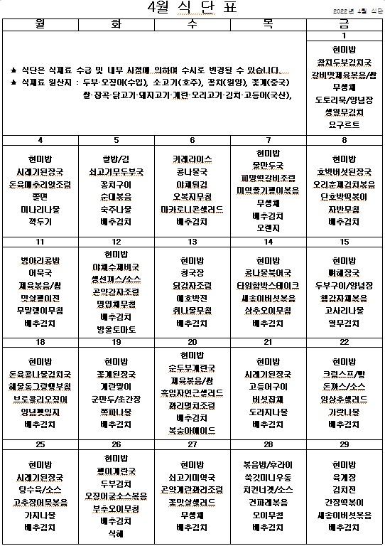 2022년 4월 식단표 ^^ 페이지 정보 작성자 관리자 작성일22-03-30 19:12 조회3,243회 댓글0건 이전글 다음글 목록 본문 코로나가 아무리 심해져도 우리의 열정을 막을순 없죠. 맛있고 건강한 식단으로 힘을 내서 슬기롭게 코로나를 이겨내보아요. ^^ 이전글 다음글 목록