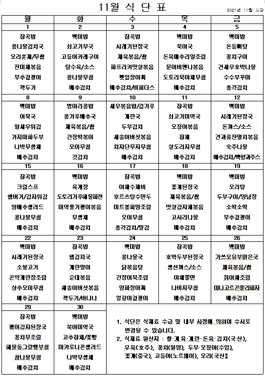 2021년 11월 식단표 ^^ 페이지 정보 작성자 관리자 작성일21-10-29 15:03 조회3,632회 댓글0건 이전글 다음글 목록 본문 날씨는 쌀쌀해지고 있지만 맛있게 먹고 힘내서 열심히 생활합시다! ^^ 이전글 다음글 목록