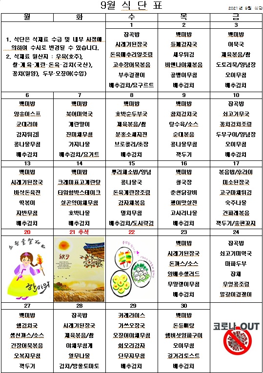 2021년 9월 식단표 ^^ 페이지 정보 작성자 관리자 작성일21-09-01 17:25 조회3,478회 댓글0건 이전글 다음글 목록 본문 맛있게 먹고 힘내서 화이팅! ^^ 이전글 다음글 목록