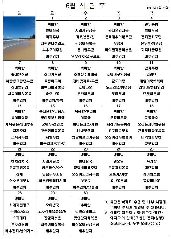 2021년 6월 식단표 페이지 정보 작성자 관리자 작성일21-06-01 14:49 조회3,627회 댓글0건 이전글 다음글 목록 본문 맛있는 점심을 먹고 힘을 내서 지금 이 시국을 잘 이겨내보아요! ^^ 이전글 다음글 목록