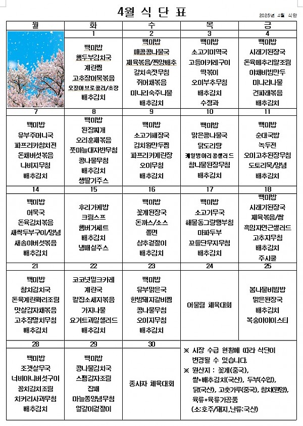 2025년 4월 식단표 ^^ 페이지 정보 작성자 관리자 작성일25-03-28 09:03 조회541회 댓글0건 이전글 다음글 목록 본문 4월에도 맛있게 먹고 힘 내서 열심히 일하겠습니다! ^^ 이전글 다음글 목록