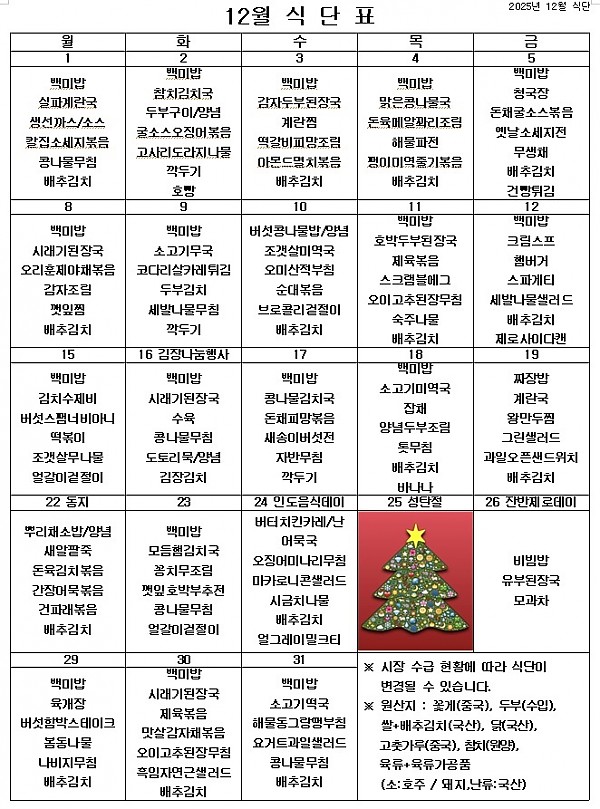 2025년 12월 식단표 ^^ 페이지 정보 작성자 관리자 작성일25-11-27 21:11 조회177회 댓글0건 이전글 다음글 목록 본문 12월에도 맛있게 먹고 건강한 마음으로 열심히 일해보겠습니다. ^^ 이전글 다음글 목록