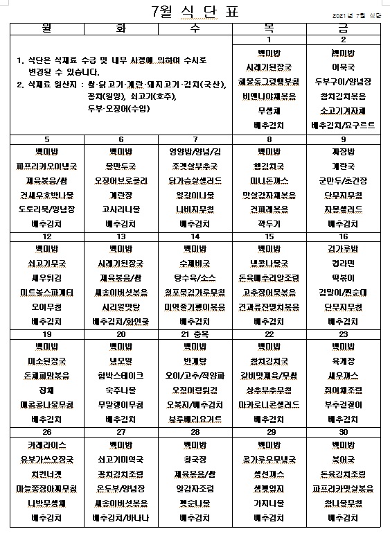 2021년 7월 식단표 페이지 정보 작성자 관리자 작성일21-06-30 15:25 조회3,470회 댓글0건 이전글 다음글 목록 본문 더워지는 여름 맛있게 먹고 모두 힘냅시다! ^^ 이전글 다음글 목록