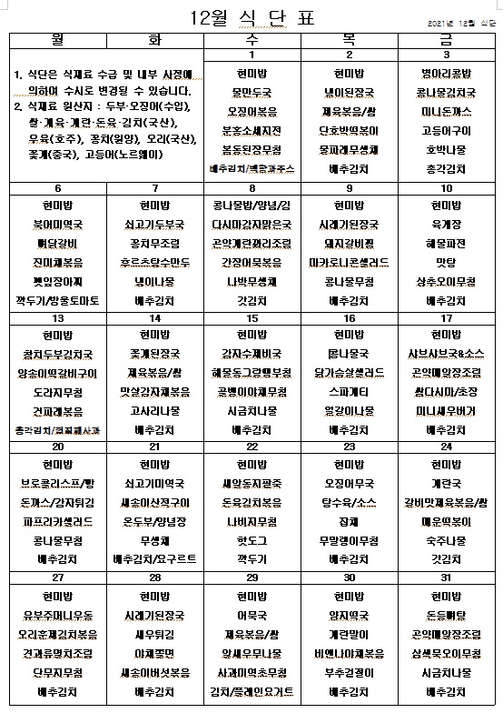 2021년 12월 식단표 ^^ 페이지 정보 작성자 관리자 작성일21-11-30 09:10 조회3,323회 댓글0건 이전글 다음글 목록 본문 어느덧 연말이 코 앞이네요. 맛있게 먹고 건강하게 지내면서 위드 코로나 시대를 현명하게 잘 이겨내봐요! ^^ 이전글 다음글 목록