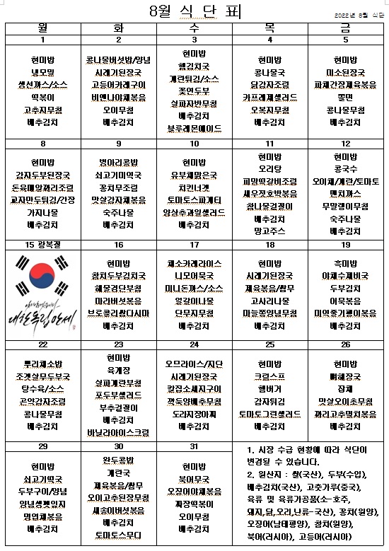2022년 8월 식단표 ^^ 페이지 정보 작성자 관리자 작성일22-08-01 09:35 조회2,958회 댓글0건 이전글 다음글 목록 본문 무더운 여름이지만 식중독에 주의하면서 깨끗하고 맛있는 음식을 제공해드리도록 하겠습니다! ^^ 이전글 다음글 목록