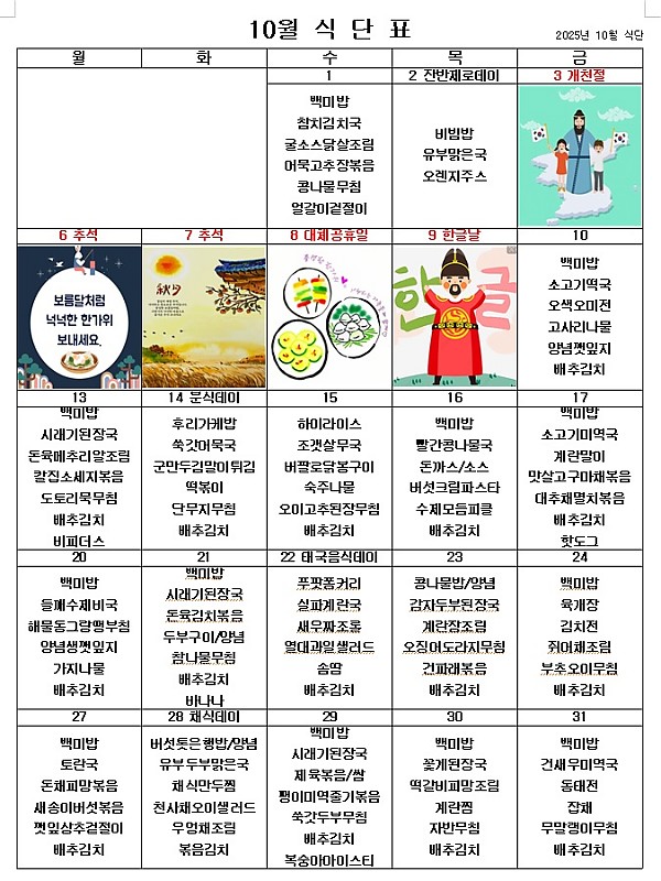 2025년 10월 식단표 ^^ 페이지 정보 작성자 관리자 작성일25-09-30 08:53 조회72회 댓글0건 이전글 다음글 목록 본문 10월에는 이용인 자조모임 희망 식단, 희망 간식을 최대한 반영하고, 잔반제로데이, 분식데이, 태국음식데이, 채식데이를 선정하여 보다 다채로운 음식을 제공해드리려고 합니다. 맛있게 먹고 열심히 일하겠습니다. ^^ 이전글 다음글 목록