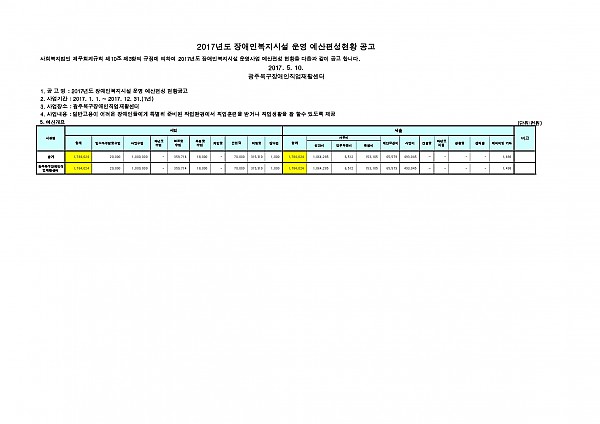 2017년 광주북구장애인직업재활센터 세입세출(예산) 공고 페이지 정보 작성자 배지연 작성일17-05-10 19:00 조회12,262회 댓글0건 이전글 다음글 목록 본문 사회복지법인 재무회계규칙 제10조 제3항의 규정에 의하여 2017년도 장애인복지시설 운영사업 예산편성현황을 다음과 같이 공고합니다. 이전글 다음글 목록