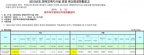 2015년 광주북구장애인직업재활센터 세입세출(예산) 공고 페이지 정보 작성자 배지연 작성일15-03-13 17:44 조회12,371회 댓글0건 이전글 다음글 목록 본문 사회복지법인 재무회계규칙 제10조 제3항의 규정에 의하여 2015년도 장애인복지시설 운영사업 예산편성현황을 다음과 같이 공고합니다. 이전글 다음글 목록