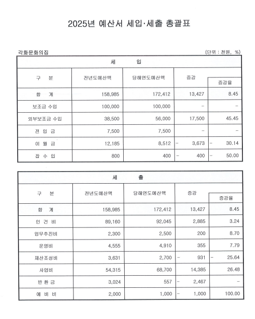 2025 각화문화의집 세입 . 세출 예산서 공고