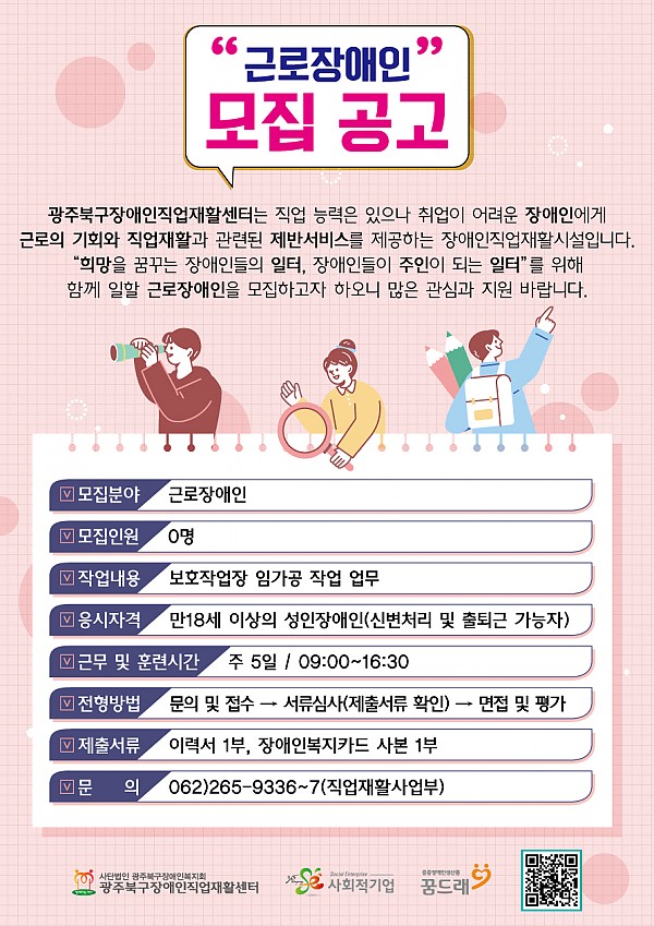근로장애인 모집 공고 페이지 정보 작성자 관리자 작성일24-05-03 15:33 조회10,032회 댓글0건 이전글 다음글 목록 본문 *미싱 작업 가능자 우대* 광주북구장애인직업재활센터에서 함께 일할 근로장애인을 모집합니다. 많은 관심과 참여 부탁드립니다. 이전글 다음글 목록