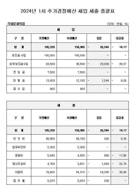 2. 공고사항 : 2024년 각화문화의집 1차 추가경정 세입·세출 예산서