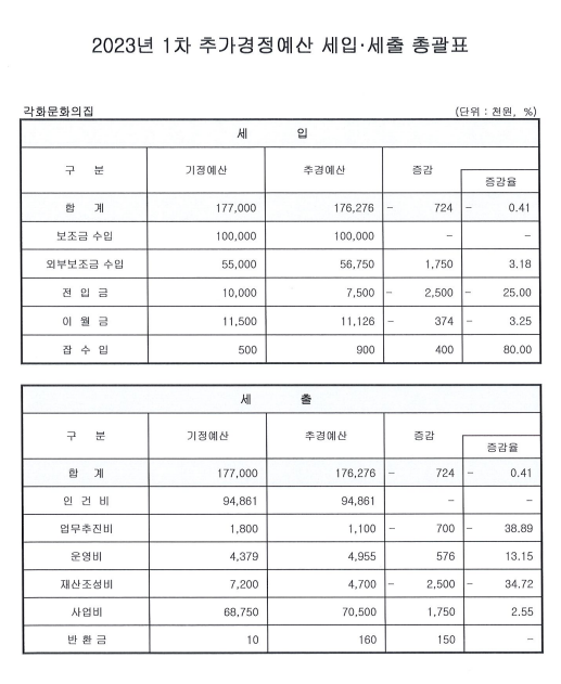 2023년 각화문화의집 1차 추가경정 예산서 공고