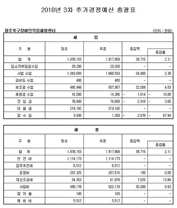 2018 광주북구장애인직업재활센터 3차 추가경정 세입·세출(예산) 공고