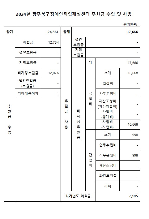 2024년 광주북구장애인직업재활센터 후원금 수입 및 사용내역 공고 페이지 정보 작성자 관리자 작성일25-03-11 16:06 조회4,606회 댓글0건 이전글 다음글 목록 본문 사회복지법인 및 사회복지시설 재무․회계규칙 제41조의 6의 규정에 의거하여 2024년 광주북구장애인직업재활센터 후원금 수입 및 사용 내역을 다음과 같이 공개합니다. 이전글 다음글 목록