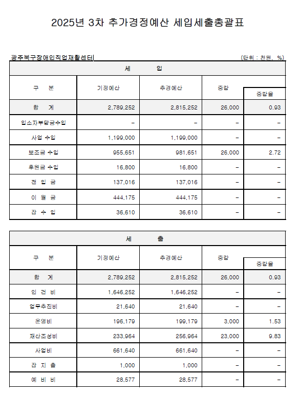 2025년 광주북구장애인직업재활센터 3차 추가경정 예산서 공고