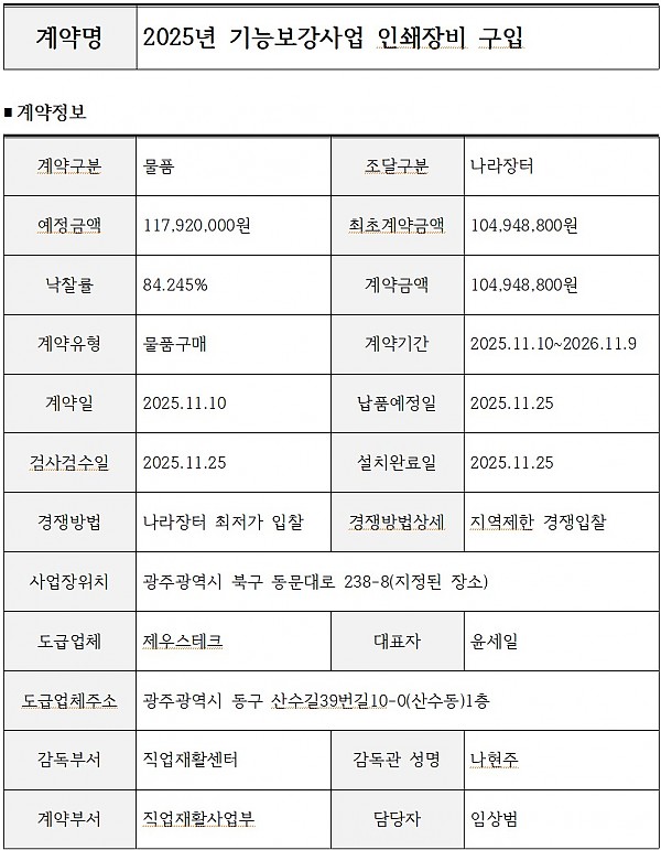 2025년 기능보강사업 인쇄장비 구입 업체 계약 정보공개 페이지 정보 작성자 관리자 작성일25-11-26 11:01 조회362회 댓글0건 이전글 다음글 목록 본문 2025년 기능보강사업 인쇄장비 구입 업체 계약 정보공개 이전글 다음글 목록